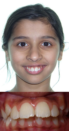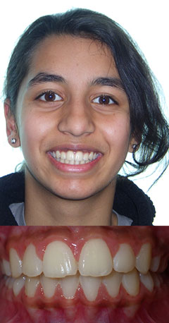 H.P. had severe dental protrusion and a lower lip habit that would have continued to flare the upper anterior teeth. Treatment could have been either with extraction of maxillary premolars or 8 months of wearing a Herbst Appliance followed by non-extraction orthodontic treatment. The Herbst Appliance, of course, is more conservative (no tooth removal) and yields a more beautiful treatment result. The treatment time was 18 months.